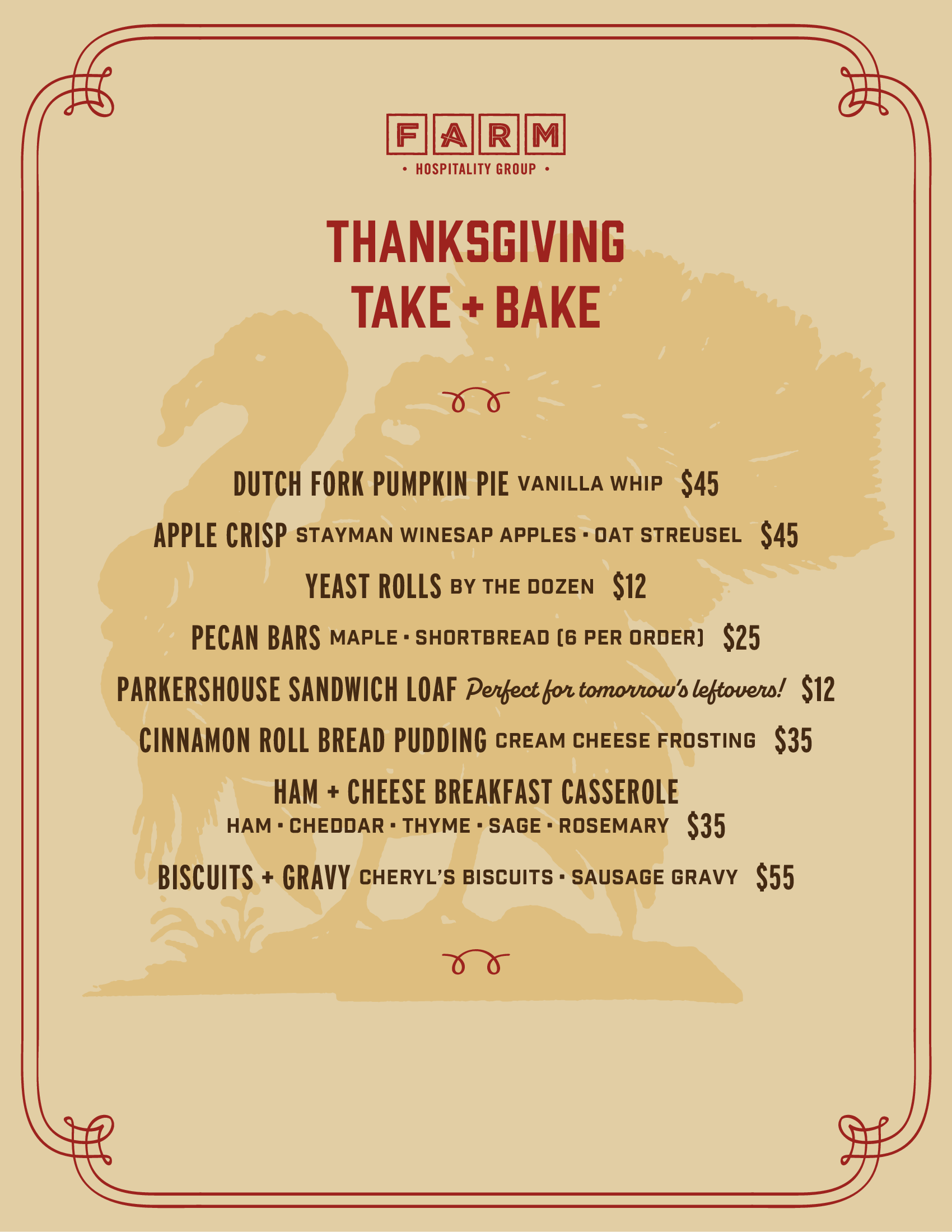 ORDER THANKSGIVING TAKE & BAKE Orders will be available for Pick-Up at FARM in Bluffton + Common Thread in Savannah on Wednesday November 26, 2025 from 12 PM to 3:30 PM.When checking out, you will be prompted to select a pick-up location and time.